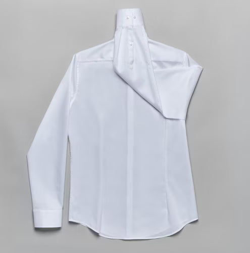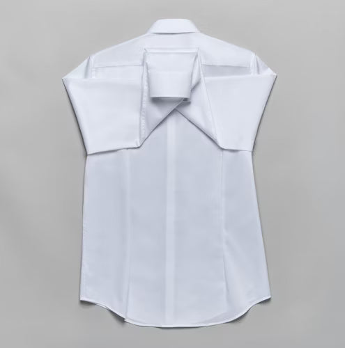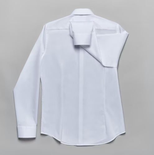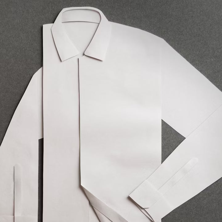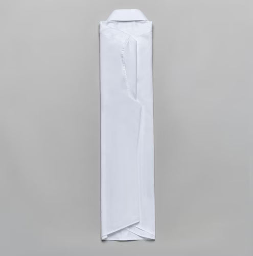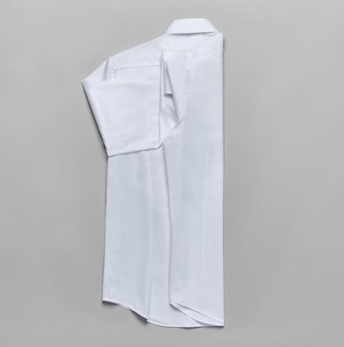Taking the approximate middle of the right-hand sleeve as a starting point, fold the sleeve upwards so that the cuff sits centrally above the collar of the shirt.