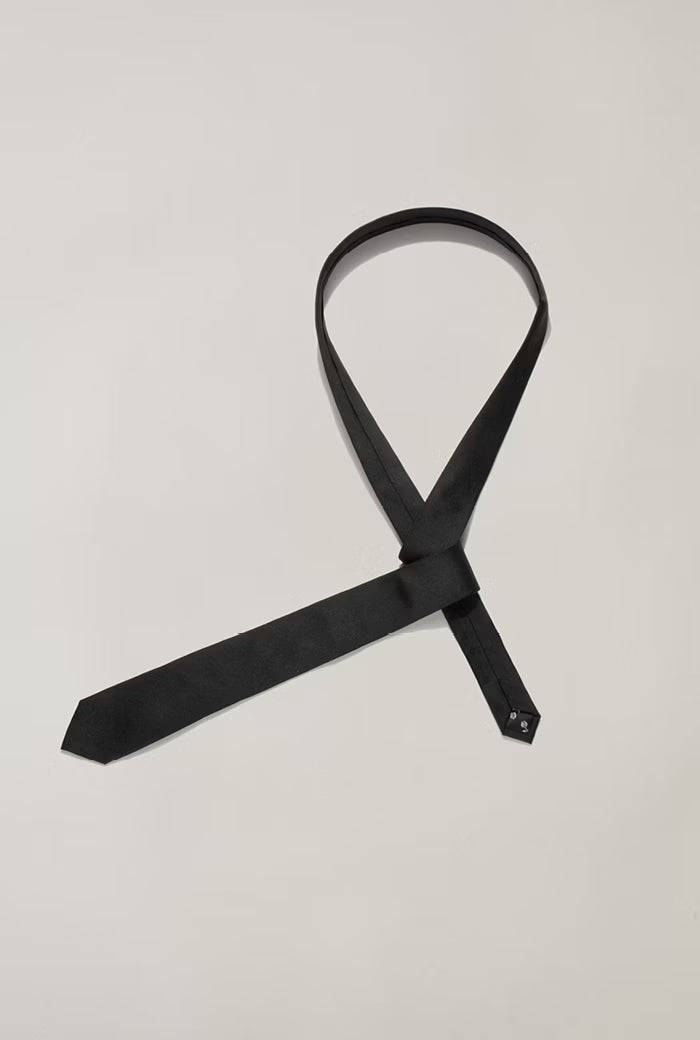 Place the broad end of the tie on top of the narrow end, moving towards the left